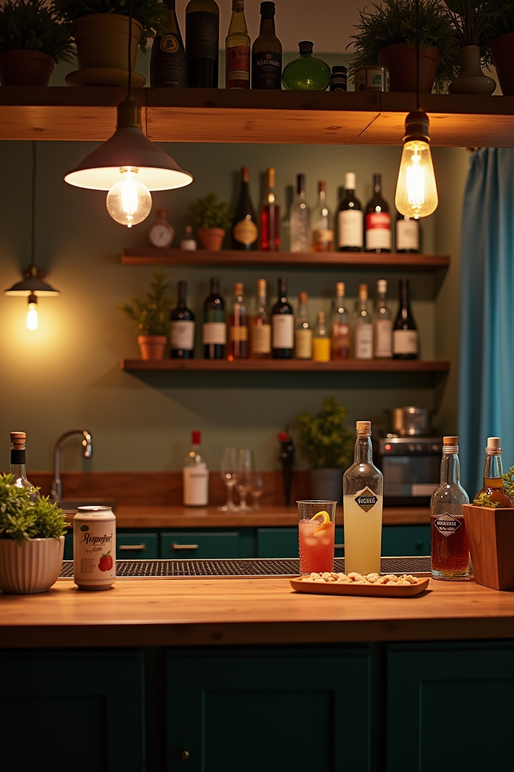 Beleuchtung: Hängende Pendelleuchten über der Bar schaffen eine einladende Atmosphäre und setzen die Getränke in Szene.