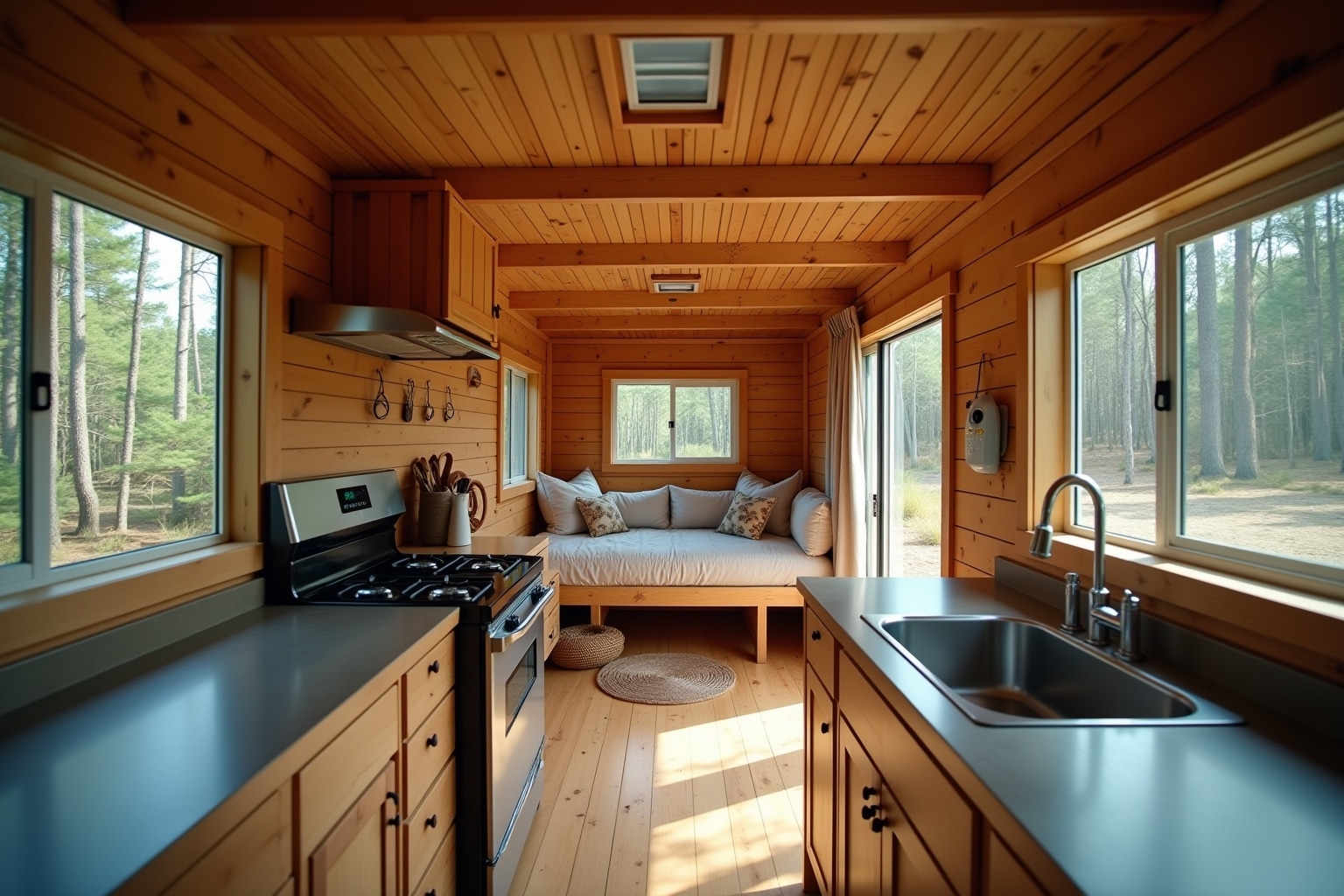 - Das Tiny House auf Rädern: Ein voll ausgestattetes Mini-Haus mit Küche, Bad, Schlafbereich und Wohnzimmer.