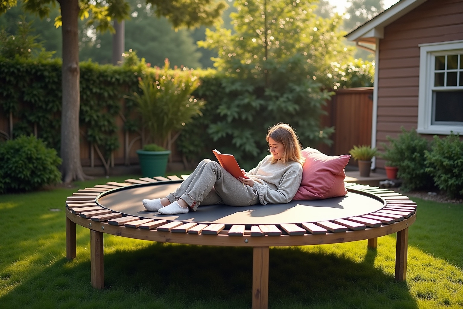 - Einem Outdoor-Leseplatz: Statte dein Trampolin mit bequemen Kissen, Decken und Lichterketten aus. Ein Sonnensegel oder ein Moskitonetz sorgt für zusätzlichen Komfort.