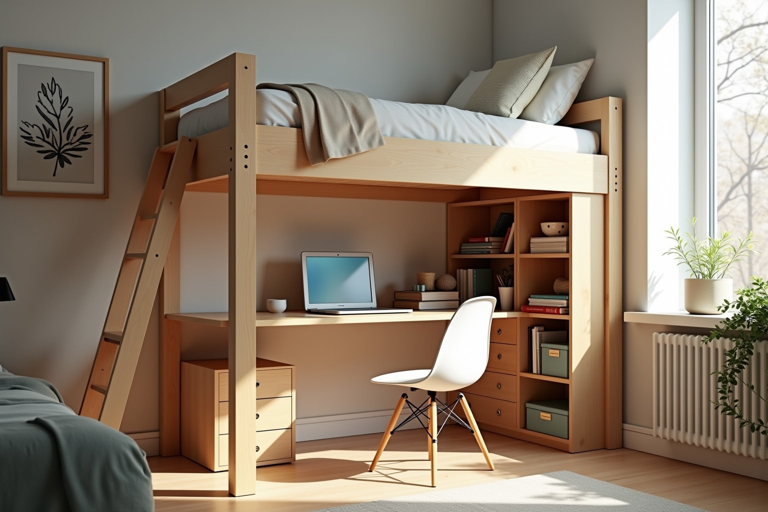 Du brauchst einen ruhigen Ort zum Arbeiten oder Studieren? Dann verwandle dein Hochbett in einen praktischen Arbeitsbereich! Der Platz unter dem Bett bietet genügend Raum für einen Schreibtisch, Regale und alles, was du zum Arbeiten brauchst.