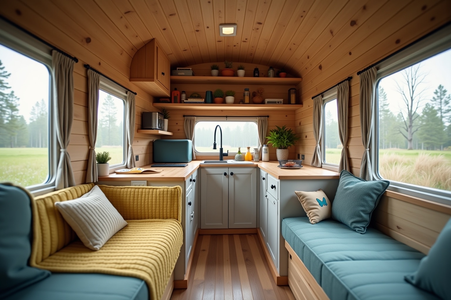 Baue oder kaufe die Möbel für deinen Wohnwagen. Achte auf eine platzsparende und funktionale Gestaltung. Verwende leichte Materialien und clevere Stauraumlösungen. Gestalte den Innenraum nach deinen persönlichen Vorlieben mit Farben, Textilien und Accessoires.